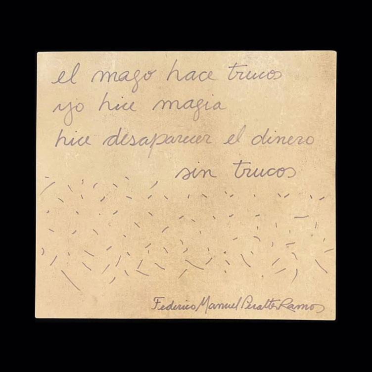 La mención explícita al dinero en el poema otorga a la obra un valor documental igualmente excepcional, mientras que la pintura abstracta del reverso amplía su carácter de objeto único, no reproducible ni serializable.